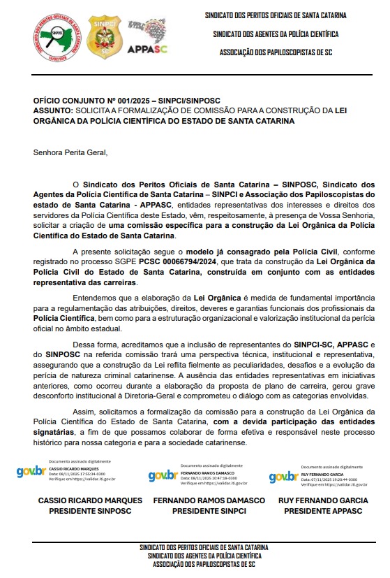 Na manhã desta segunda-feira, 10 de novembro de 2025, os representantes do SINPCI, SINPOSC e APPASC protocolaram um ofício conjunto solicitando oficialmente à Perita-Geral da Polícia Científica a criação de uma comissão específica para a construção da Lei Orgânica da Polícia Científica de Santa Catarina.
