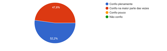 Por outro lado, o cenário é completamente diferente quando se analisa a percepção sobre o SINPCI. A preliminar da pesquisa demonstra que 100% dos respondentes confiam no sindicato, sendo 52,2% com confiança plena e 47,8% com confiança na maior parte das vezes, resultado que evidencia aprovação praticamente unânime. Esse índice reflete uma atuação pautada pela transparência, escuta ativa da base e execução efetiva de ações em defesa da categoria.
